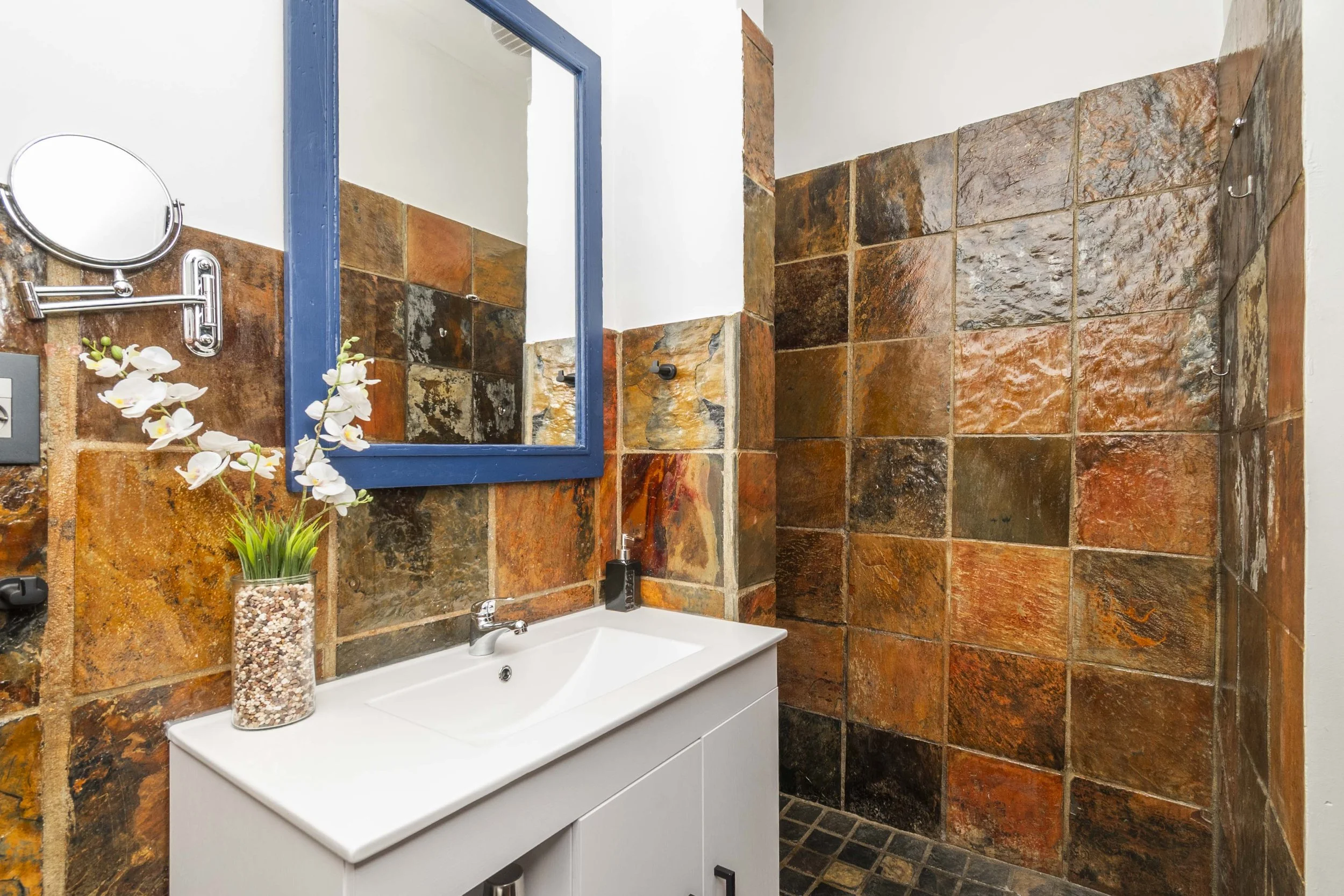 The bathroom includes an oversized vanity basin with shelves and a cabinet, a large walk-in shower, in-shower rack/hooks, an over-sized mirror, two large 35”x59” (90cm x 150cm) bath towels, hand towels and washcloths along with a hairdryer and a make-up mirror.