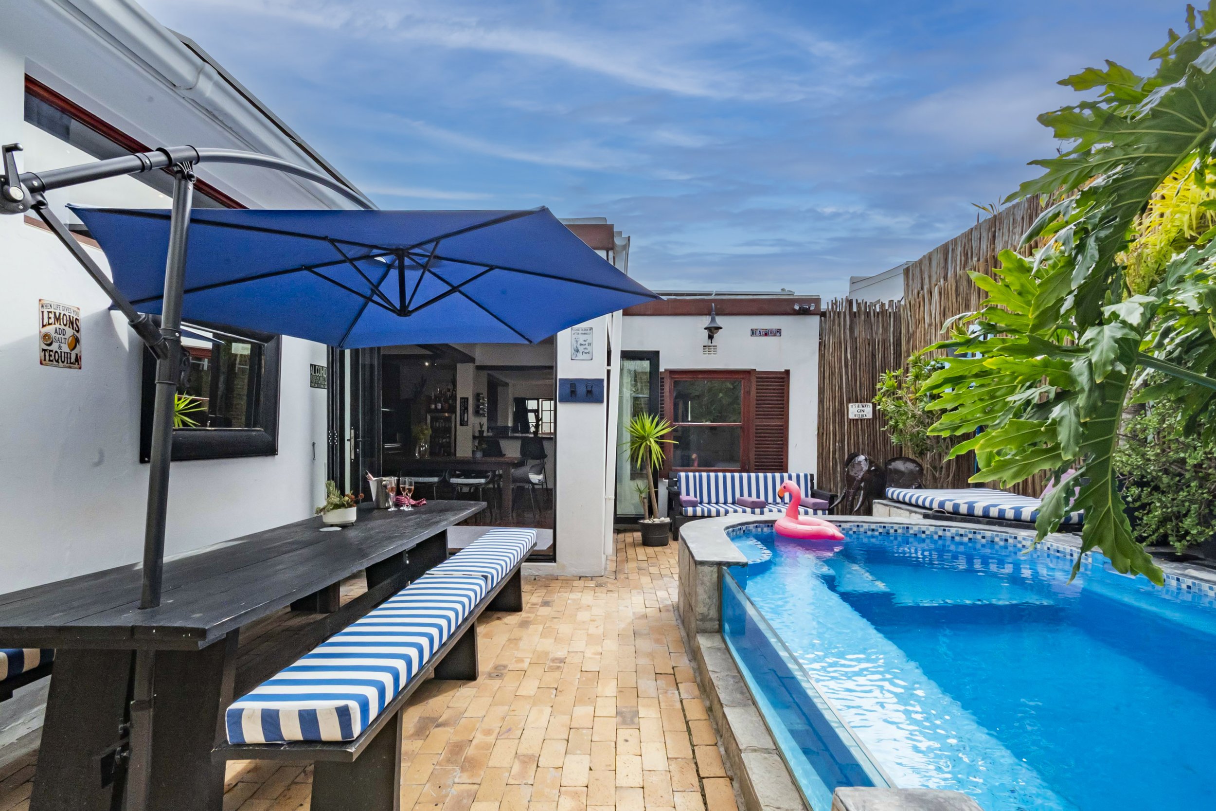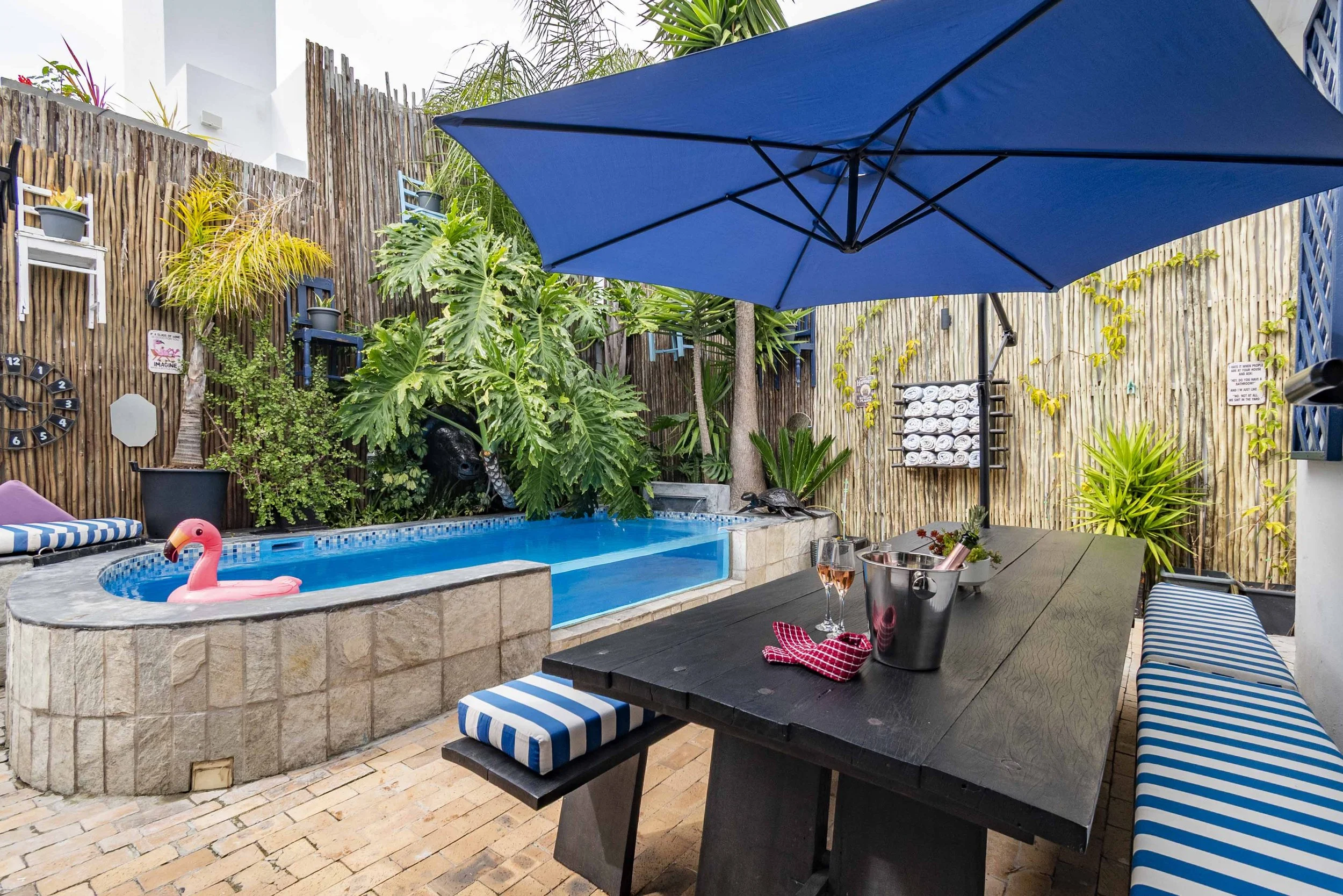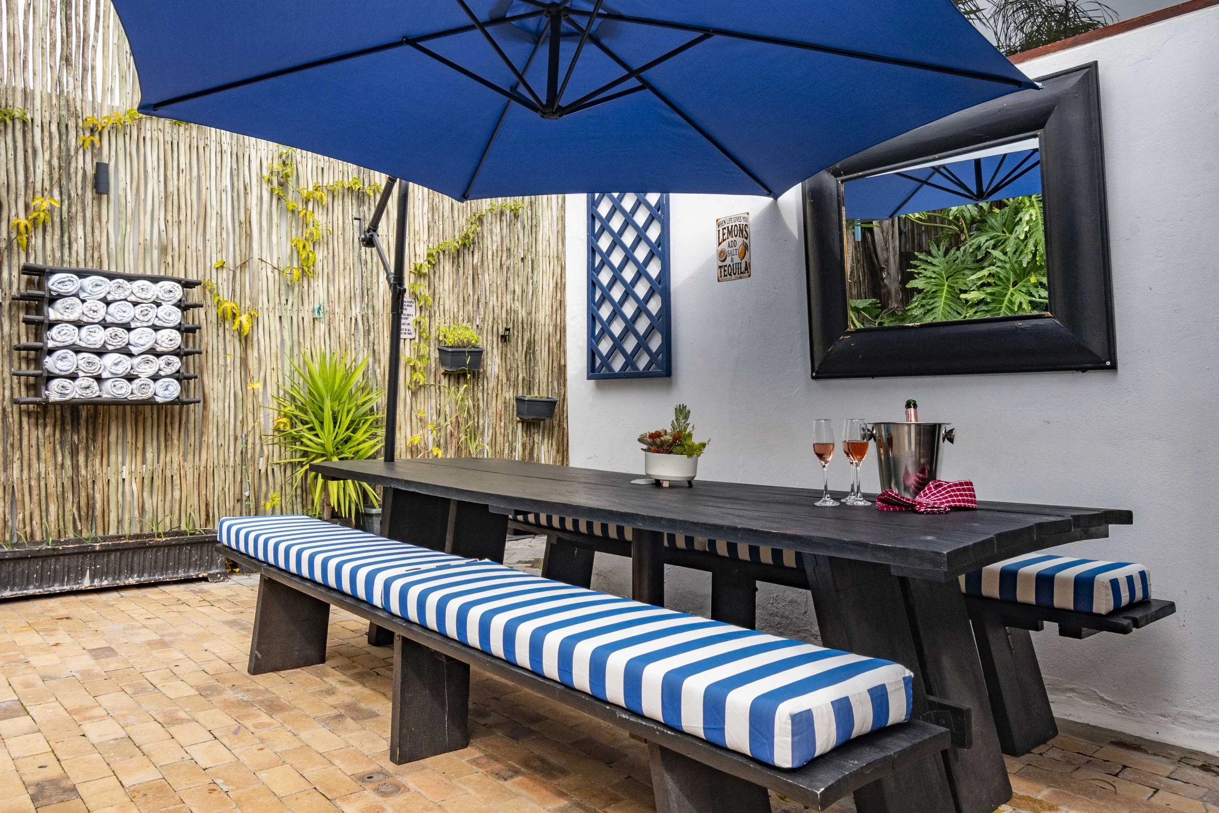 As you walk through the right door, you’ll find a covered area and a cabinet to hold the outdoor cushions/chairs. You’ll continue along the right side (doors to Buffalo and Giraffe are located here), with a wall filled with grape and passionfruit vines, lemongrass plants and a variety of vegetables including peppers, tomatoes, lettuces and herbs (when in season). Here you’ll also find a small cushioned bench and a few cabinets with braai supplies and pool toys along with a braai (BBQ). Just before entering the back garden area, we have an outdoor shower for a quick rinse after a day at the beach or pool. The back courtyard is a great entertaining and relaxing space. The picnic table with cushions offers seating for 12 people with an umbrella and even has a built-in electrical outlet. The 100sqft pool (9.3sqm) is 5ft (1.5m) at its deepest point with graded steps from the side and enough room for 12 people. As a half-above ground pool, you can easily step over the glass wall for access to an internal bench with seating for up to 6 people. Surrounded by lush greenery including palm trees and monsteras, the beach palette of wooden chairs with black potted plants and mirrors scattered across the walls. An Amazon Echo is situated in the corner to play music while relaxing. Along the side and in the back pool area there are 2 cameras to ensure safety and security in these areas.